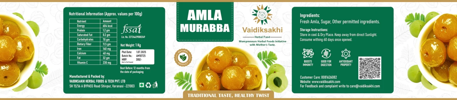 VaidikSakhi’s Amla Murabba is crafted using a cherished, age-old recipe to preserve the natural goodness of Amla, one of Ayurveda’s most treasured superfruits. Our premium quality Indian gooseberries are carefully selected and sweetened to perfection, creating a tender, juicy, and flavorful murabba.